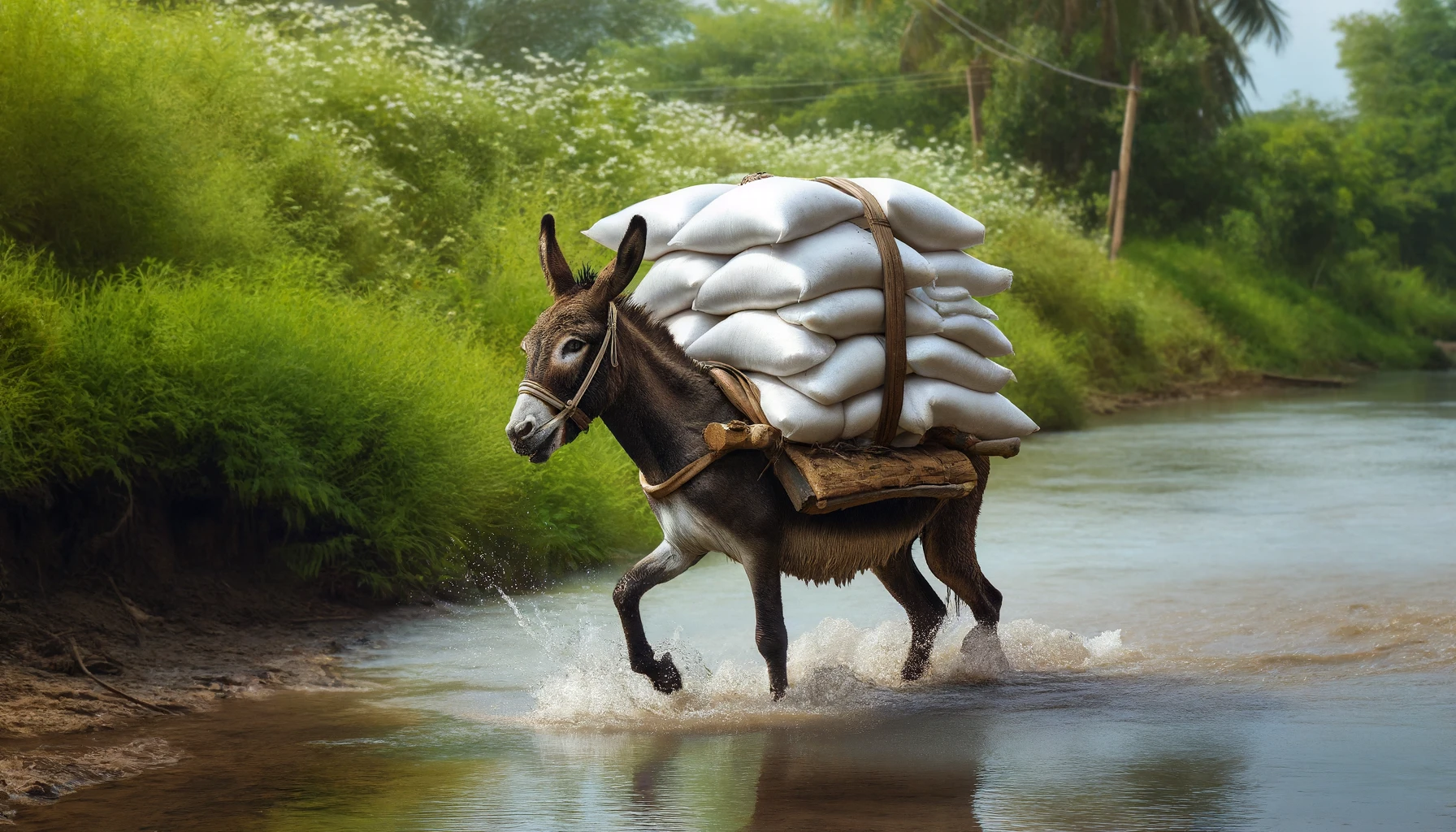 وفي أحد الأيام اضطرّ البائع والحمار لقطع نهرٍ صغير من أجل الوصول إلى السوق، غير أنّ الحمار تعثّر فجأة ووقع في الماء، فذاب الملح وأصبحت الأكياس خفيفة ممّا أسعد الحمار كثيرًا.